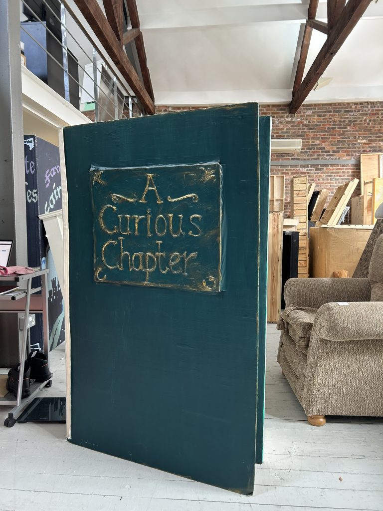 A prop cardboard book that opens up. The cover is painted a dark green, with the writing ‘A Curious Chapter’. Inside there is a clear plastic sheet with colourful drawings of a tree & writing. More photographs are available.