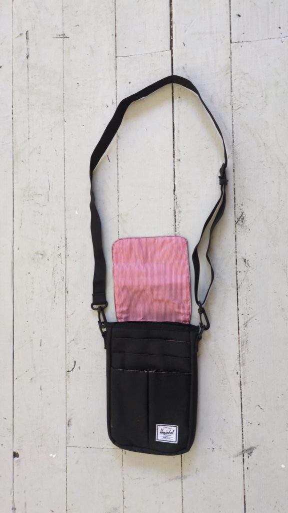 Heschel black adjustable cross body purse, magnetised opening with six pockets, quite sturdy.