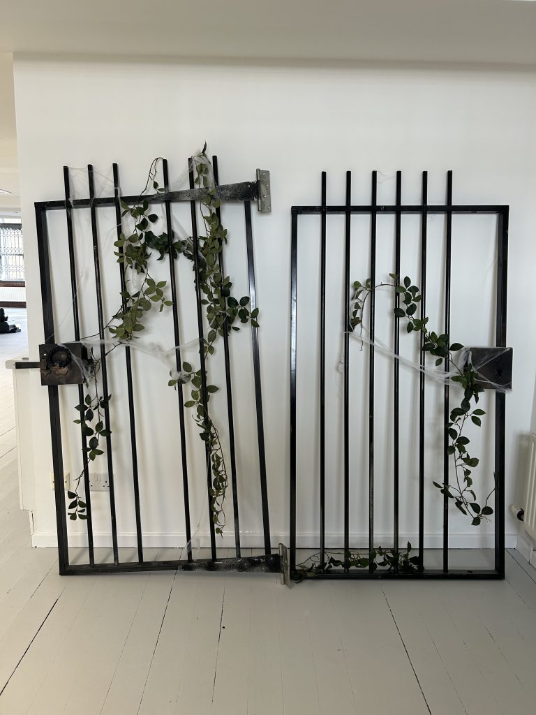 Two full size metal gates with fake leaves and spider webs.