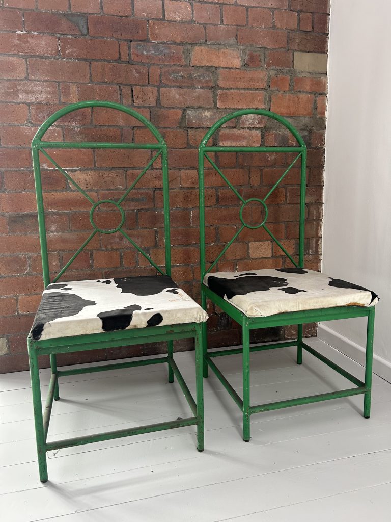 Two metal green chairs with cow print cushion seats, donated by Opera North.