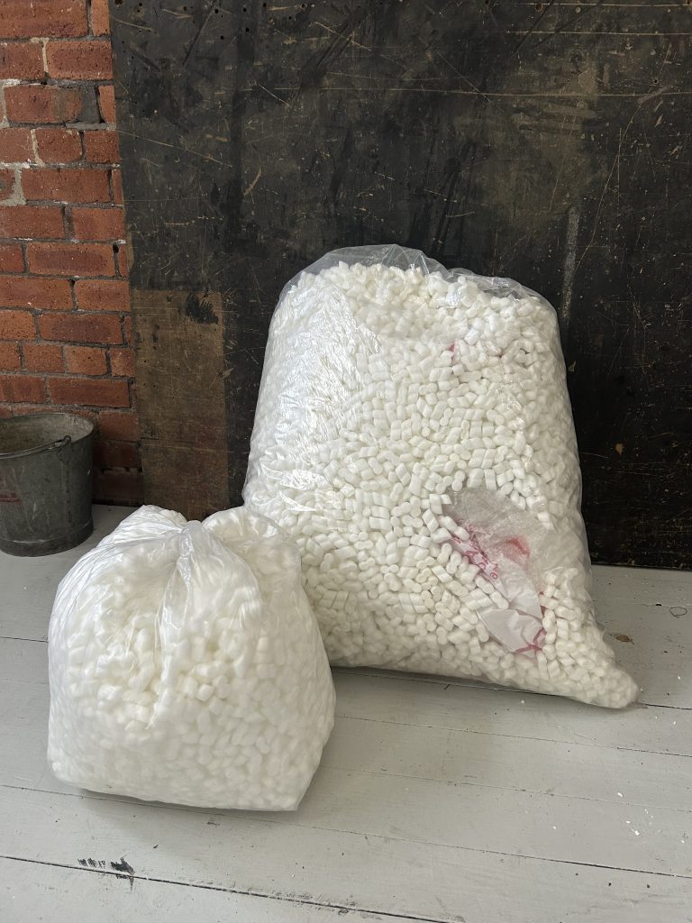 One large bag and one small bag of white packing peanuts, designed to fill empty spaces in shipping boxes but could also be used as interesting material for creative projects.