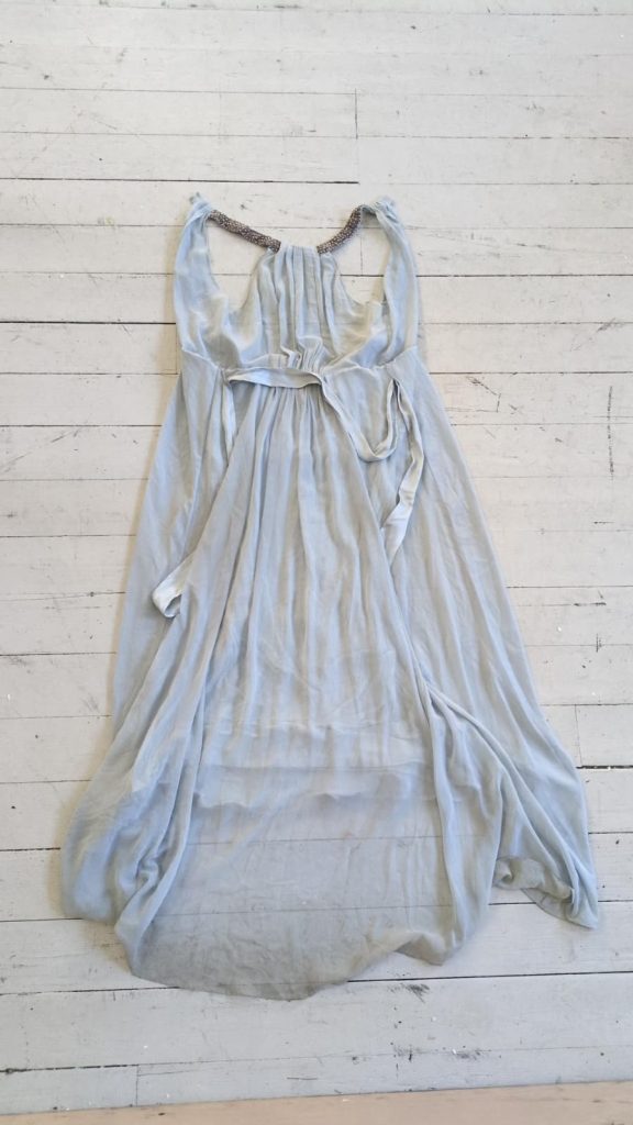Sheer with a lining, UK 12, pearls/sequins adorn the shoulders. Tie for around the waist and a zip at the back.
