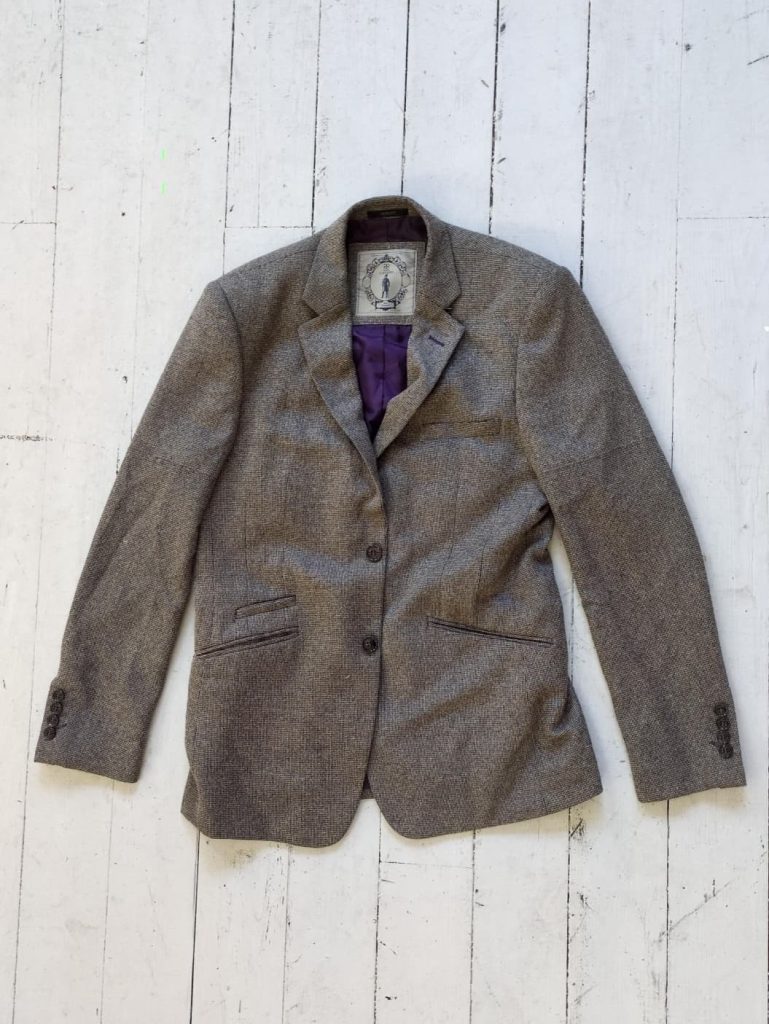 House of Cavani tweed jacket with purple lining and inside pockets. Slim fit.