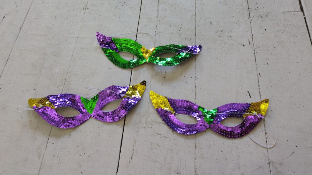 A set of three paper and sequin eye masks with elastic ties. Multicoloured.