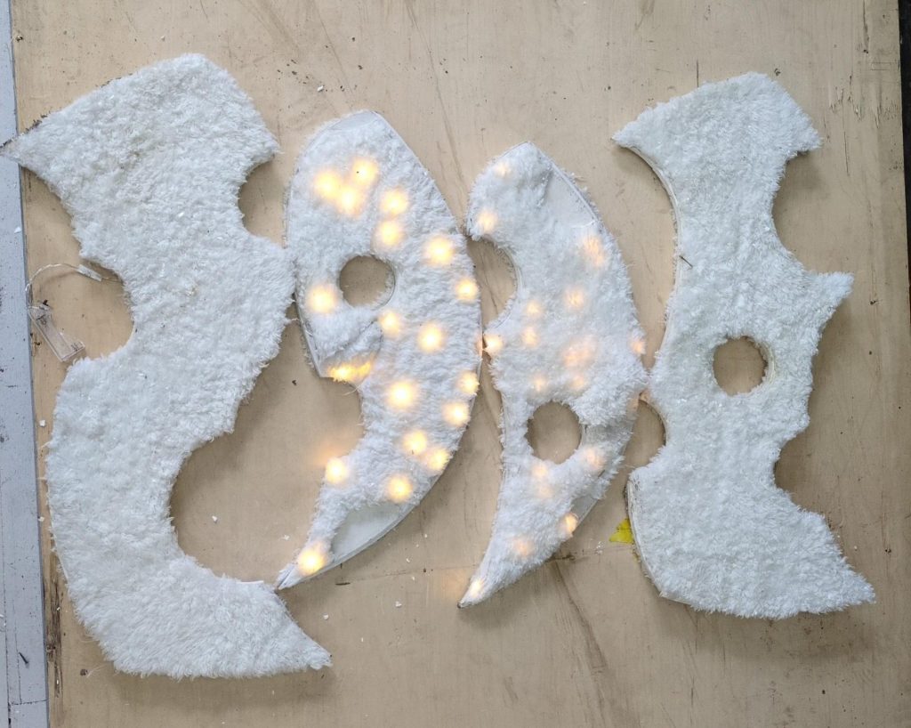 A set of four small pieces of varying shapes used originally in Whiskers First Winter. Fairy lights inside but two of the pieces not working.